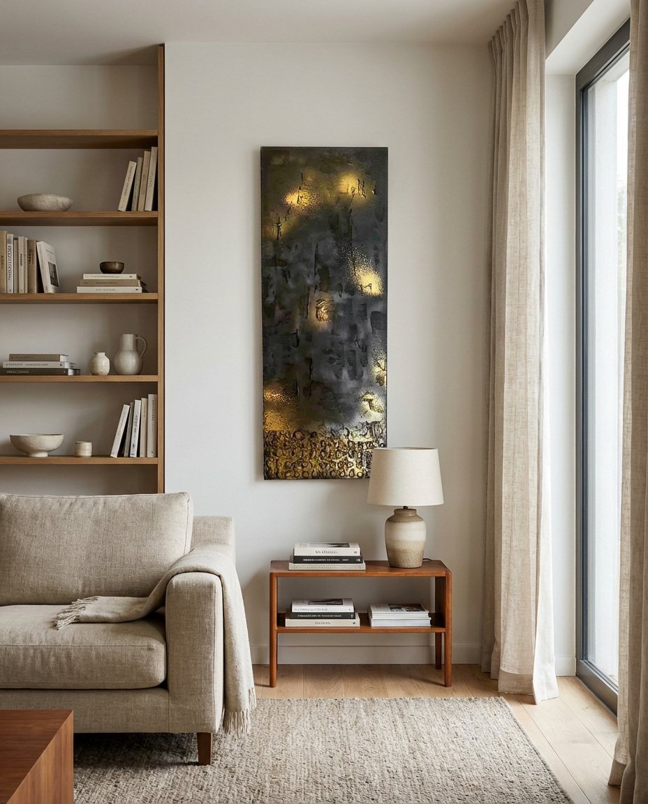 Quadro abstrato ideal para compor a decoração de salas, quartos, escritórios, halls de entrada, corredores, áreas de recepção e outros ambientes que valorizam o design e a sofisticação. Indicado para quem aprecia decorações contemporâneas, elegantes e de alto padrão, este quadro traz equilíbrio entre arte e estilo, transformando qualquer espaço em um ambiente inspirador.